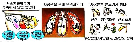 - 난산으로 인한 산도의 상처 및 무리한 후산제거 등으로 인한 통증으로 계속 뒤에 힘을 줄 때
