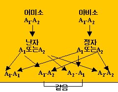예를 들면, A라는 유전자가 있고, 유전자 A에는 A1과 A2의 두 종류가 있다고 하자. 이경우에 어미소가 가지고 유전자가 A1-A2, 아비소도 A1-A2의 짝이라고 하면, 송아지의 유전자로서는 다음과 같이 세가지 방법의 경우를 생각할 수 있다. 이와 같이 하나의 유전자에 기착해서도 전형제(全兄第: 친형제) 소들이 반드시 같은 모양을 갖는다고 말할 수 없다.