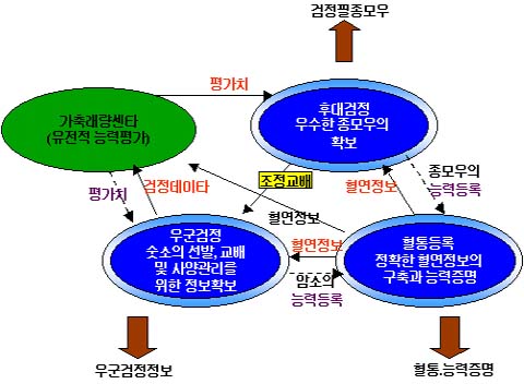 또한, 유전적 능력은 부모소로부터 자축으로 이어져 나간다. 그 때문에 젖소개량을 위해서는 정확한 혈연정보가 필수불가결하다. 혈연정보는 "혈통등록"에 의하여 구축되고 있다. 특히, 최근의 유전적 능력 평가 방법에 있어서는 혈통정보를 충분히 활용하기 위해서는 그 중요성이 점증되고 있다. 그림 1과 같이 우군검정, 후대검정, 혈통등록의 세가지 사업이 말하자면 젖소개량을 추진하는 가장 중요한 세가지 기둥이 되는 것이다.