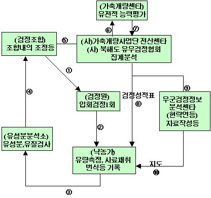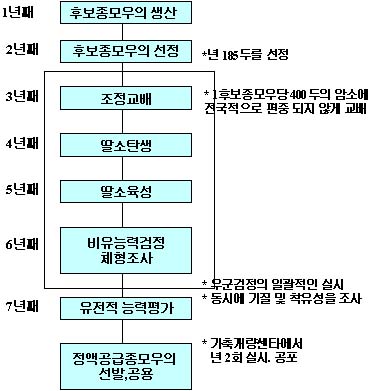 후대검정은 후보종모우의 작출과 선정, 우군검정농가의 암소에 대한 교배(이하 조정교배라부르자), 우군검정농가에서의 딸소생산으로부터 능력검정, 유전적 능력평가, 종모우의 선발등의 각 과정으로 이어진다. 사업의 흐름은 <그림3>에 표시된 그대로이지만, 후보종모우의 선정으로부터 유전적 능력평가까지는, 국가의 보조사업을 중심으로 하여 실시되고 있다.