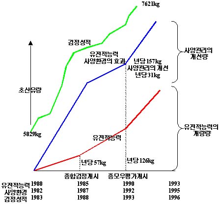 가축개량센터에서 암소의 유전적능력평가를 시작함으로써 국내의 젖소개량실태가 명확하게 되었다. 암소의 유전적 능력의 생년별의 평균치 추이가 바로 이것을 표시하고 있다. (그림31참조) 또한 사양관리 개선의 실태도 명확하게 되었다.(그림32참조) 〈그림4〉은 유전적능력개량, 사양관리개선, 실제유량(검정성적)의 증가를 종합해서 표시한 것이다. 어느 경우이건 초산유량으로 기준을 하였다. 유전적능력개량과 사양관리개선이 그대로 유량증가로 나타나 있는 것을 알 수 있다.